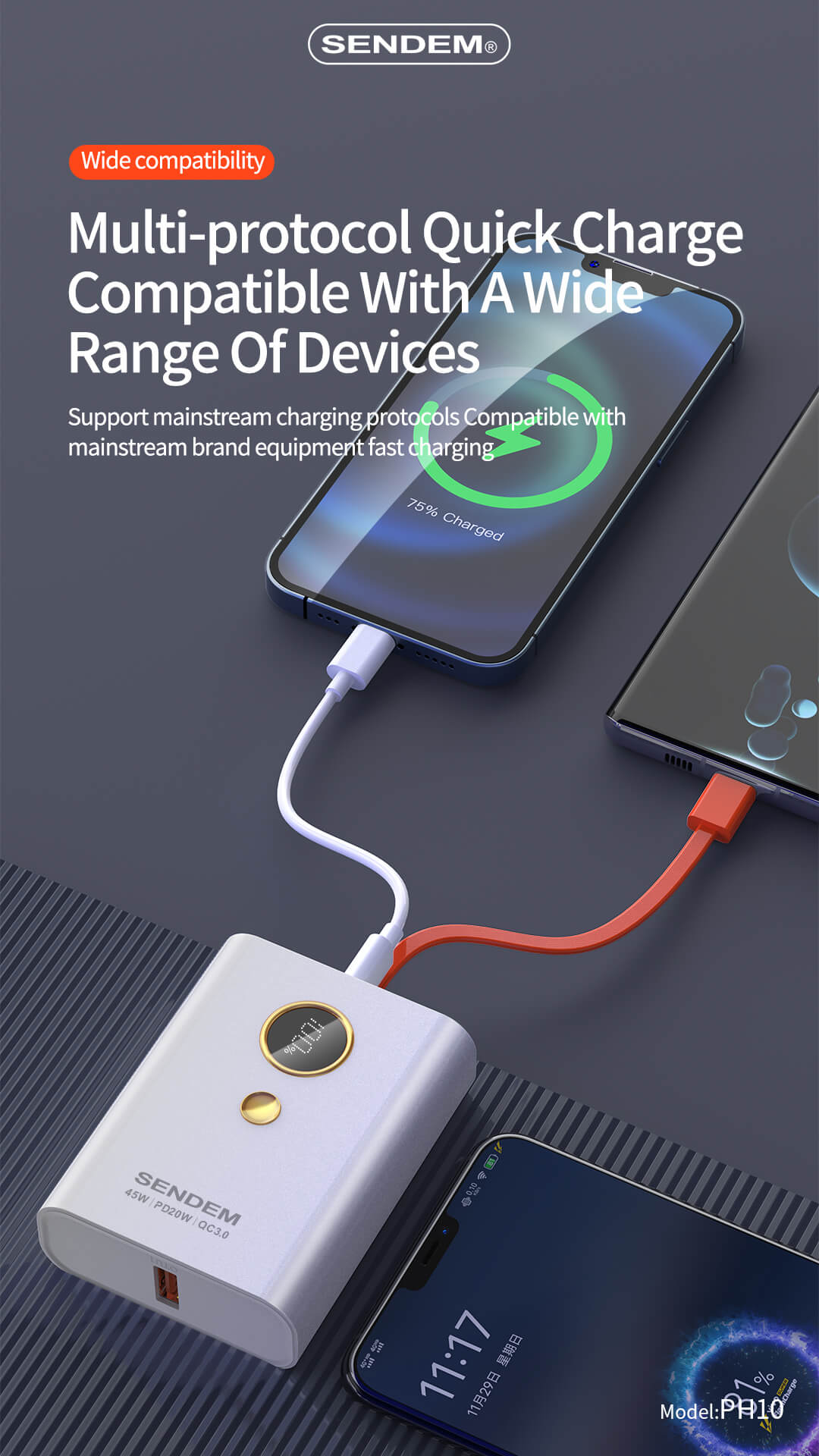 2.PD20W fast charge 20W Fast Endurance No,Waiting In Line For Charging.Equipped with TypeC data cable, it is fully compatible with45W fast charging and PD20W fast charging protocols,and there is no need to queue for charging.